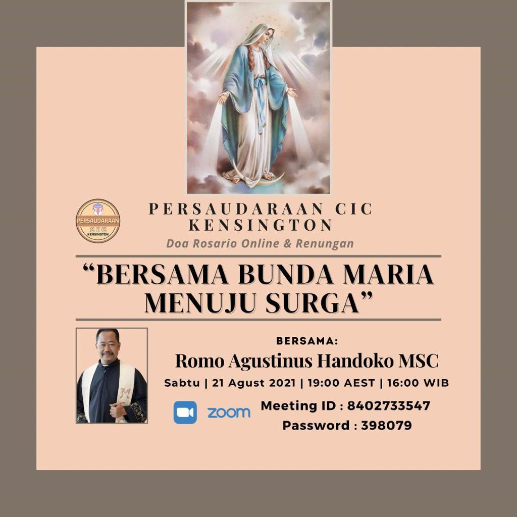 Shalom semuanya, SIE PERSAUDARAAN CIC Kensington mengundang saudara-saudari sekalian untuk mengikuti doa rosario bersama secara online dan renungan akan dibawakan oleh Pastor Agustinus Handoko MSC.